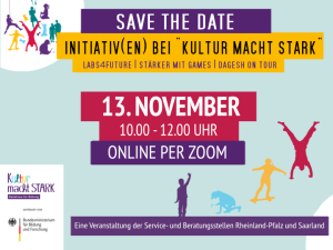 Die kooperative Infoveranstaltung der Beratungsstellen Baden-Württemberg, Hessen und Rheinland-Pfalz richtet sich explizit an Beschäftigte aus Kindertagesstätten, Schulen, Schulsozialarbeit, kommunale Verwaltung, Vereine, Kulturzentren, Jugendkunstschulen, Künstler*innen und potenzielle Honorarkräfte für kulturelle Bildungsprojekte aus dem ländlichen Raum und den angrenzenden überregionalen Zentren und bietet Möglichkeiten zur Vernetzung und Austausch.